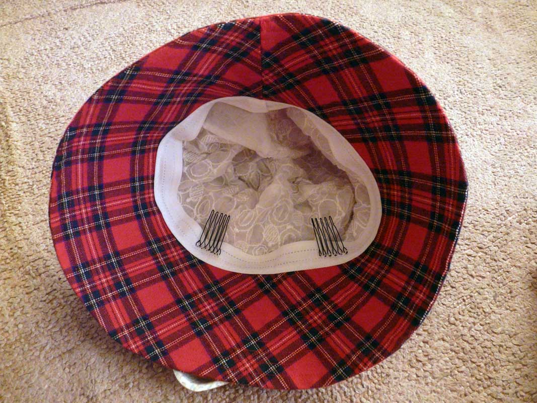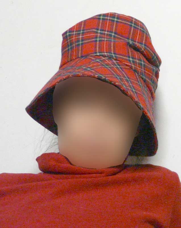 表地:綿ビエラ タータンチェック (安田商店5丁目店) 裏地:綿レース 85cm巾 650円/m (服地のアライ) 他の素材:UVカットニット用接着芯(Haro*Beh)、ソフトな帽子用サイズテープ25mm幅 ¥20/10cm(Haro*Beh)、帽子用 織りタイプ≪かっちり≫接着芯 (90cm) ¥600/1カット(90cm)(Haro*Beh)