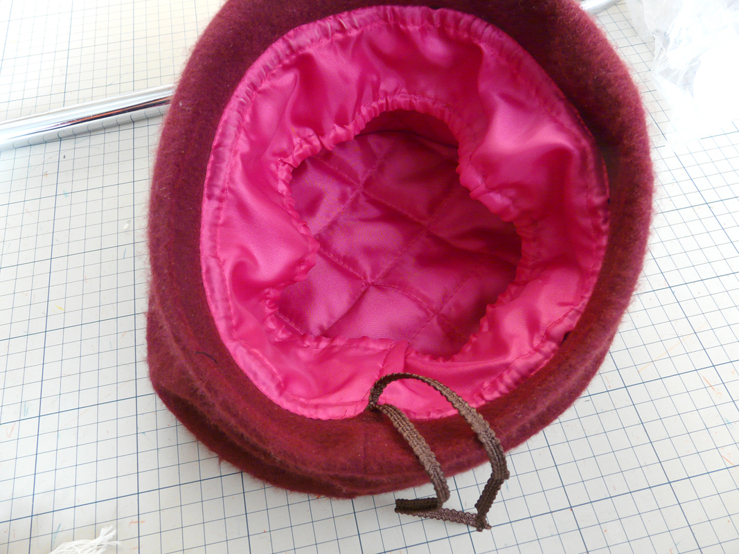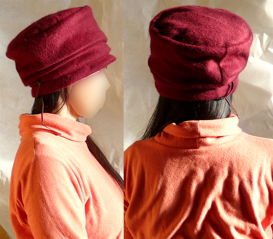 生地:毛混 フラノ ボルドー【秋冬用(中厚長起毛)】(Advance Net) 裏地:冬美人#1515 850濃いピンク 500円/m(yoshimi) 附属:0.5cm巾×10m巻 315円(手芸ナカムラ)、キルトワタ ポリエステル130cm巾×1m 厚み:約5mm 210円(手芸ナカムラ)、平ゴム(8コール6mm幅×30m)白 315円(手芸ナカムラ)、オリジナルスパン60番/1200m巻 #616ワイン(ボビン)160円、キングスパン 60番/3,000m#249赤紫(ボビン)300円 前回から、写真の構図を変えています。 帽子は、全身のバランスを考えて選ぶ、と本に書いてあったので、バランスがわかりやすいように引いて撮ることにしました。 表は、毛混のやわらかめの長毛フラノ。 裏は、キルトワタを抱かせたコート用裏地。 裏で形を整えて、表生地をたるませてかぶります。 かぶってみたら、「風の谷のナウシカ」で、城の中でタペストリーの伝説をオババさまに聴いていたときのナウシカの帽子に似ているなあ、と(笑) フラノ + キルト裏地 で、文句なしに温かいです。 この冬、ヘビーユースです。 裏はこのようになっています。 7cm幅のサイズテープを使うように書いてあったのですが、そんなもの持ち合わせているわけもなく、裏地でサイズテープもどきを作っています。冬用の厚手の裏地だから、いっか、と思って。 サイズテープのサイズ元のところに紐を通し、しっかり締めるよう、本に書いてありました。 確かに、縦長の帽子なので、このままでは鼻まですっぽり帽子の中です。 しかし、どんなに紐を締めても、髪がツルツルなので、けっきょく帽子がずるずる下がって、鼻まですっぽりです。 で、サイズテープもどきの、サイズ元の反対側の端に6mm幅の平ゴムを通しました。長さ46cmぐらい。 このおかげで、帽子を耳の上で留めても、耳まですっぽり覆っても、好きなところで留まってくれます。 これも接着芯を使わなくていいのがうれしい。 帽子やバッグって、意外に接着芯代がバカにならなくて困ります。 PR