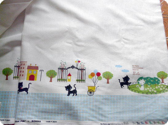この生地は、両端で柄がちがう。 ※ この柄は、PUSHPINのオリジナルキャラクター、 Der name eine boshafte schwarze katze ist Lolo いたずら好きな黒猫、名前はロロ。 ステーショナリー(ポストカード、メモ、ノート、ペン等)、ストラップ、布、鞄など、グッズがあるらしい。 プロフィールは不明だが、クリスマスカードを見ると、白猫のお嫁さんがいて、黒猫と白猫の子どもがいるらしい。4人家族。 PUSHPIN ●本日の買い物 ミシン糸 白 大巻 ¥567 鞄用ハード芯0.5m ¥708 黒猫ロロのモーリークロス(¥1260)2m ¥2520 パウダーチョークスリム 青 ¥520 (このパウダーチョークスリムは失敗だった。チャコの粉を、校庭のライン引きみたいにつけていくはずなんだけど、粉の付きが悪すぎ) PR