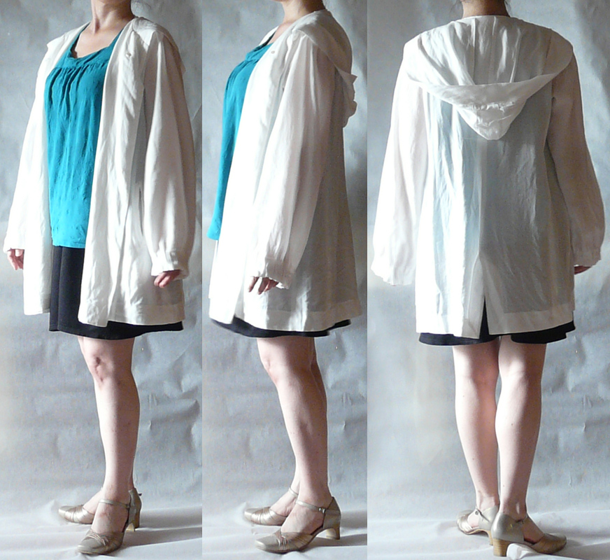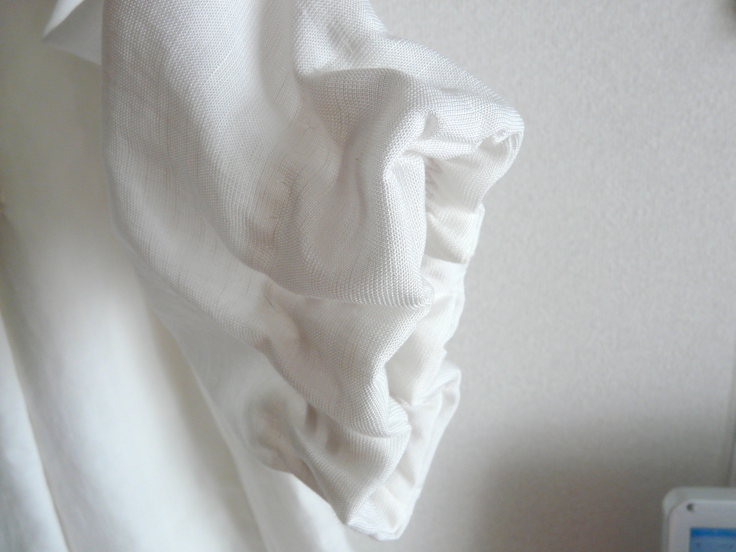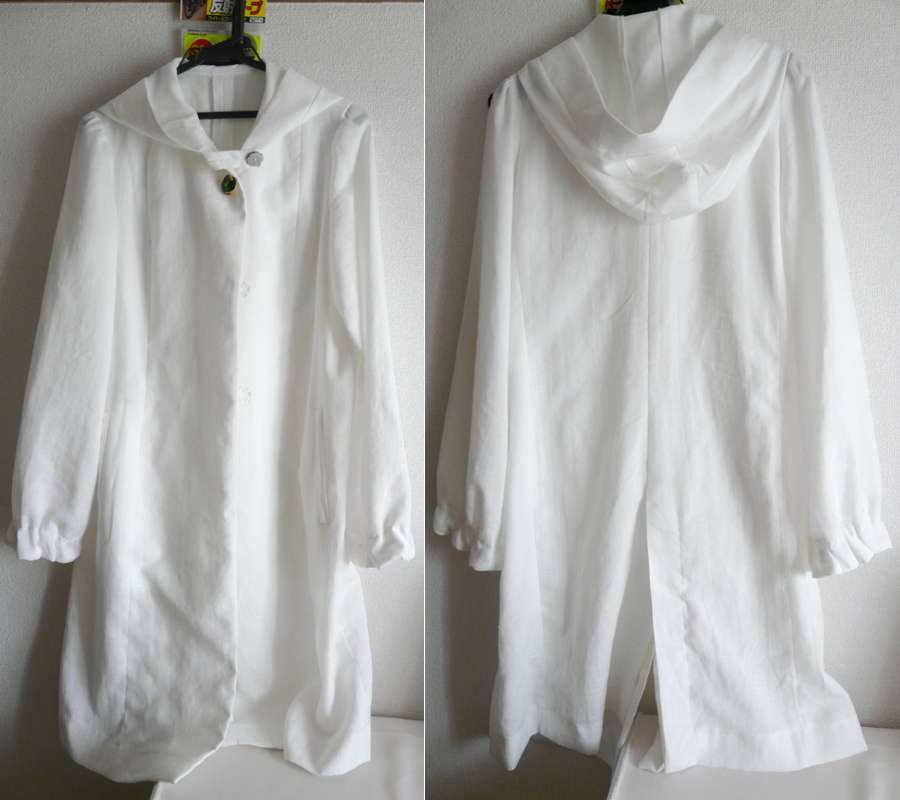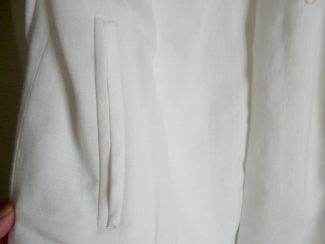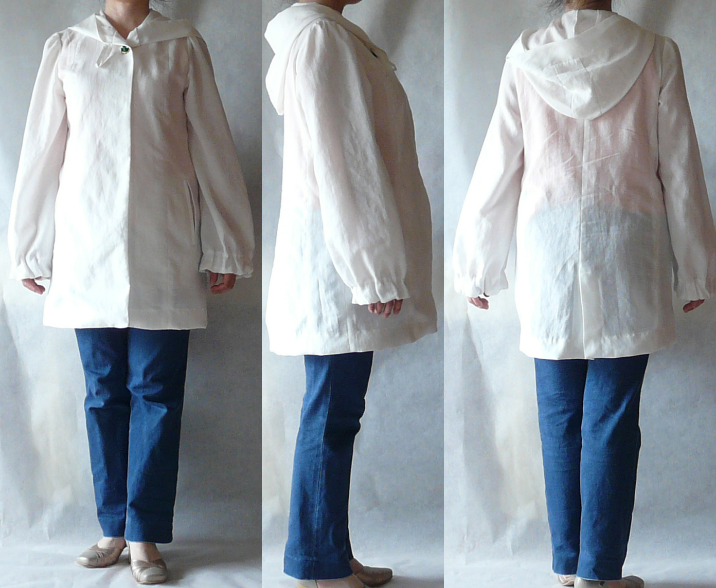 型紙:PDF型紙 3Violaフーデッドパフスリーブコート size38 ¥4,320 (Annee patterns) 生地:リネンと化繊の混紡 布帛 アレンジ: 幅出し 8cm 反身体補正 NPを1.5cm後ろに移動 着丈 デフォルトより、前から脇で19cm、後ろで16cmカット。 裏地 なし(デフォルトは裏地あり)。 フード元には白の大きなボタン。 前立てには、いちばん上は先日購入した金×緑のボタンで、下の二つは透明スナップ。 3つ買ってきて、真ん中のをつけました。 28mmと大きいですが、紙粘土で作ったような軽さです。スペイン製。日暮里 熊谷商店にて。 丈は22cmカットにしてもかっこよかったです。 今回は、ちょっとワンピースっぽいラインがドレッシーですてきだと思ったし、長いのが着たかったので、19~16cmカットしました。ミニワンピぐらいの丈かな。後ろを長めにしました。 意外に縦ラインができて、着やせ効果があります。 袖口の見返しにはゴムが叩いてあり、上品な印象のパフスリーブになっています。 両玉縁ポケット。 口布が、両玉縁にするにはギリギリだったので、たぶん片玉縁にすべきなのだと思います。 赤の矢印のところ。 首回りの縫い代は目立つ場所なので、バインダー始末にしました。 手芸ナカムラのフラットバイアスを使いましたが、違和感なしです。 丈を詰める前の、デフォルト丈。 ラインは美しいのですが、私が羽織ると白衣にしか見えません。運動公園に着て行ったら、学生たちにギョッとした顔で何度もガン見されました…orz たぶん、骨格診断でウェーブの人には苦手な素材(生地)+苦手な丈(長すぎる)なのが重なったからでしょう。 丈を短くしたら、白衣感は消えました。 接着芯。 今回は透け感のある生地なので、シフォン芯を使いました。 丈を詰める段になって芯が足りなくなり、ボビンから透明芯(#10)を購入。 右上がボビンの透明芯(#10)。 左下がアネで買ったシフォン芯。 微妙に透明度がちがうのと、織り目がちがいます。 透明芯は、きっちり平織りの織り目が見えます。 シフォン芯は、織り目がもしゃもしゃっと、変わり織りになっているので、表生地の織り目に影響しません。 実際に貼ったところ。 上は透明芯。 写真ではわかりにくいのですが、平織りの織り目が少し目立ちます。張りがあり、弾力なし。 表から見ると、シフォン芯より若干目立ちます。 引っぱるとびよんびよんと伸びます。ニットにも貼れます。 下はシフォン芯。 少しきらきらします。張りは少なく、弾力があります。少しだけしっかりしているけれど、やわらかい風合い。 たぶん、シフォンに貼ったら、こちらのほうが目立たないと思います。 まったく伸びません。 透明芯には不満が残るので、ニット芯として使うことにします。 ともあれ、violaは発売当初から欲しかった型紙です。 フード付き、パフスリーブ、パネルライン、シングル。 こういうコート大好き。 ボタンが一つだけのコートは、インパクトのあるボタンを持ってくるのが粋だと思います。 ボタンの裏側は、襟を折り返して目立つところなので、ちょっとお洒落に、力ボタンとして白い貝ボタンを使いました。 ボタンホールは、28mmの大きなボタンなので、職業用では限界越え。エクシードで縫いました。問題なし。 化繊(たぶんポリ)だからUV効果があるし、少し厚めの生地だけれど織り目が粗いので風通しがよく、ブロードより涼しいです。 ウォーキングやランニングにも良かったですよ。 PR