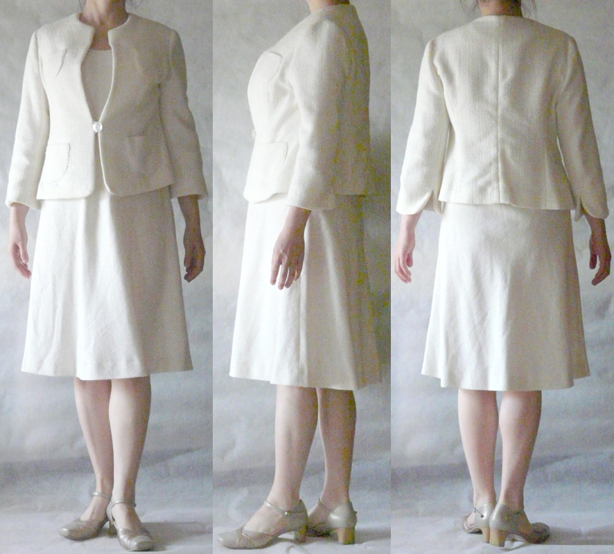 生地:ファンシーツイード 銀ラメ入り 140cm巾 ¥700/m(日暮里 服地のアライ) 裏地:キュプラ アレンジ: 幅出し6cm 胸出し2cm なで肩補正0.5cm 反身体補正4cm