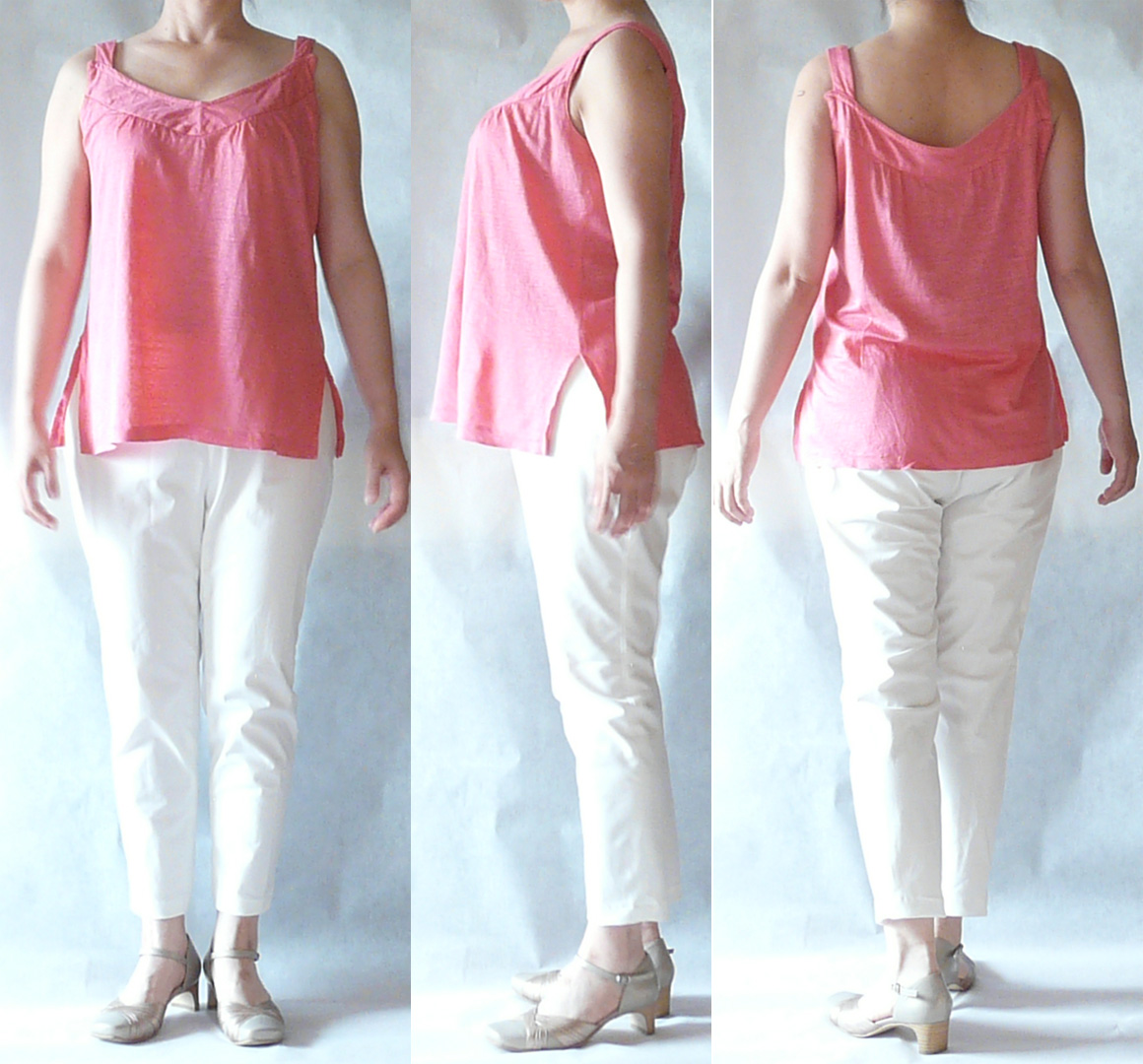 生地:やや堅めのリネンニット(日暮里 服地のアライ) アレンジ: 幅出し6~8cm(うろ覚え) 着丈+7cm 以前、硬めの布帛で作って似合わなかったので、しばらく放っていましたが、柔らかなニットで作ればいいんじゃないかと、ふと思い立ち、作ってみました。 ニットなら、いけそう。 着丈+7cmはちょっと長かったかな。 汗っかきなので、夏は背中の開いた速乾性のあるキャミなどの上に、薄地のプルオーバーまたは羽織物を着ます。 リネンは綿とちがって乾きやすく冷えにくい(冷房の入った室内に入ると、綿は凍えるんです)ので、手ごろなものを見つけては買い置きしています。 リネンニットは若干透けるので一枚で着るのはためらいますが、重ね着するには心強い素材です。 Shellyは胸元が開いてますので、着るときは内側にブラカバーをつけています。 PR