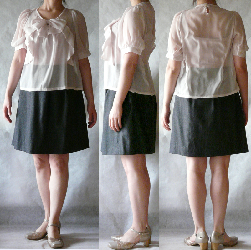 生地:ポリ楊柳シフォン (advance netのおまけ生地) アレンジ: 巾出し 6.0cm フラップなし 首周りを1cm内側に描き直し。 透け感のあるポリシフォン楊柳で、作ってみました。アネージのサイトで、楊柳がお薦めだったので。 今回は、半袖。カフス付きがかわいい。フラップなし。 垂れるリボンの位置が難しい。 トレースを間違えたんだと思うけど、左右で微妙にちがってしまい、バランスが狂ってしまった。 垂れるリボンは、なくてもだいじょうぶかも。でも、他に売ってない形だから、できるだけ付けたいところ。 背中のダーツも効いて、薄い生地で作るとシルエットがきれいに出て、美しい。 前回、ウールのダブルガーゼで作ったけれど、様相がまったく変わった。 リボンでボリュームがあるけれど、全体にすっきりした感じ。華奢な雰囲気さえ漂う。生地によって、印象がまったくちがう。私的には、今回のように薄地で作るのが○。 PR