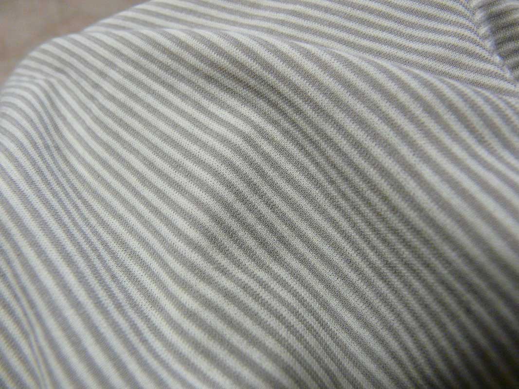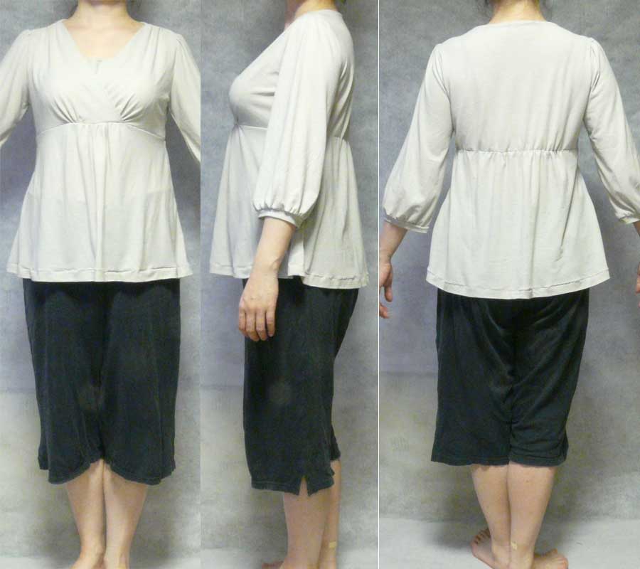 生地:綿強撚ニットボーダー、ブラウンがかったグレー 140cm巾×120cm ¥550/1.2m(布橋商店(日暮里)) アレンジ: なで肩補正 0.3cm 幅出し +6.0cm カフス幅 0.8cm幅 → 1.5cm幅 後ろ身頃と後ろ裾の縫い合わせに、長さ37cm(縫い代込み)の平ゴムを叩いてある カシュクールの合わせに、共布をあてる モダールよりは固い感じだが、これぐらいのギャザーには問題なし。 こんな感じになってくれないかなーと期待したら、デフォルトでは、ハイウェストの幼女的なかわいい感じだった。 つまり、私が着ると妊婦服……orz。 しょうがないので、この服と同じように、後ろ身頃のウエスト部分だけゴムを叩いた。 少しはマシになったけど、後ろ裾のギャザーが効いて、ふくらんでしまう。 次回はギャザーをなくして、ゴムを叩く予定。 強撚じゃなく、もっとやわらかい生地を使えば、ギャザーのふくらみも、マシになるのかな??? 着丈も5cmぐらい長くしたい。 カシュクールの合わせの部分は、確かに胸はギリギリ見えないようにできている。お見事! But, 私が着ると谷間をサービスぅ〜♪ な絵になるので、共布かストレッチレース必須。 けっこう幅に余裕があるから、シフォンで作っても着られるかも知れない。 PR