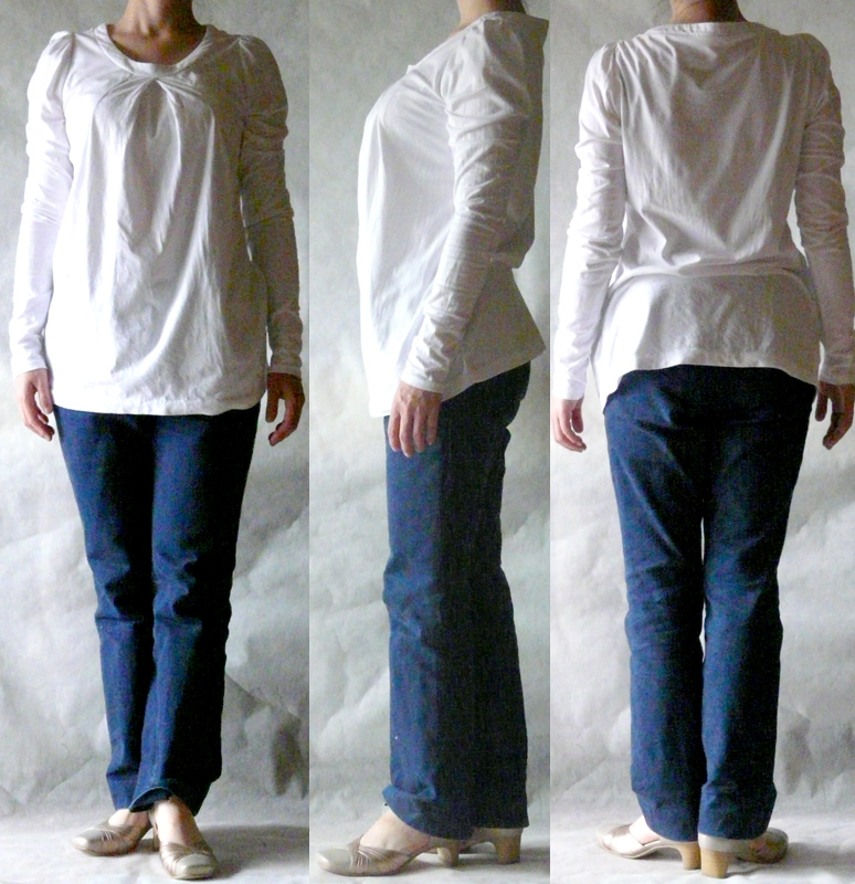 生地:コットン天竺白 170cm巾 (服地のアライ(日暮里)) アレンジ: なで肩補正 0.8cm 幅出し +6.0cm(前身頃だけ、さらに巾出し+1.0cm) 襟ぐり 1cm詰め 襟ぐり伸ばし付けを、芯貼りの襟ぐりヨークに変更 袖 巾だし+1.5cm さらにギャザー分+1.0cm ただし、袖口巾はデフォルトのまま