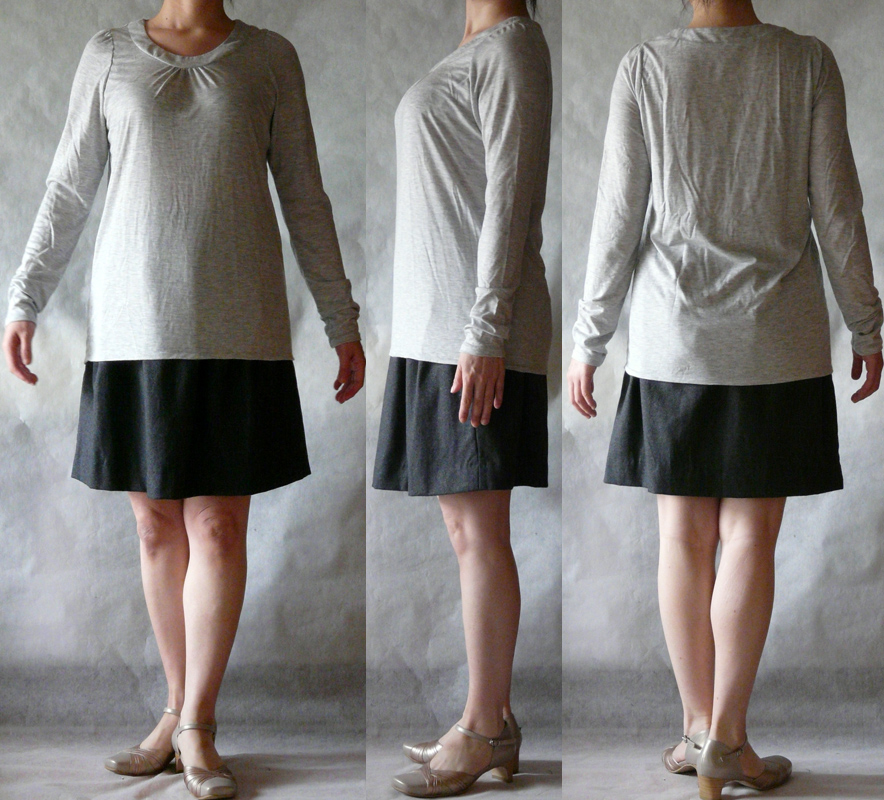 生地:コットンモダールニット 杢グレー 160cm巾×1.45cm ¥550/1.8m(布橋商店(日暮里)) アレンジ: 幅出し +6.0cm 襟ぐり線をスクエアから、エミネのオプションV襟に書き直し スクエアネックが似合わないので、エミネのオプションV襟を参考に、襟ぐりを描き直しました。 袖幅は少しだけ失敗。そのまま巾だししてしまったので、袖口幅が広がりすぎた。袖口幅は、38sizeのデフォルトを維持したほうがいいみたい。 でも、とても気に入りました。 とりわけ、肩幅が狭いところが、大のお気に入り。 momoに比べると、脇のラインが、momoはコクーンシルエット。こちらは、裾までストンと、ほぼまっすぐに落ちるシルエット。 それから、肩の付け根が、こちらはmomoより内側に入っています。そのため、ぜんたいにほっそりして見えます。 そして、袖山にギャザーが入っていて、写真では見えにくいですが、ふんわりした感じが優美で○。 PR