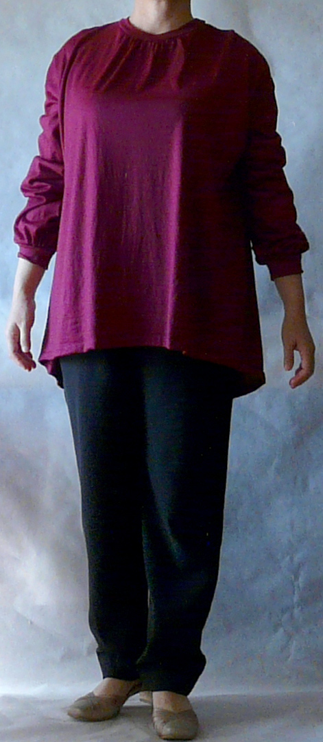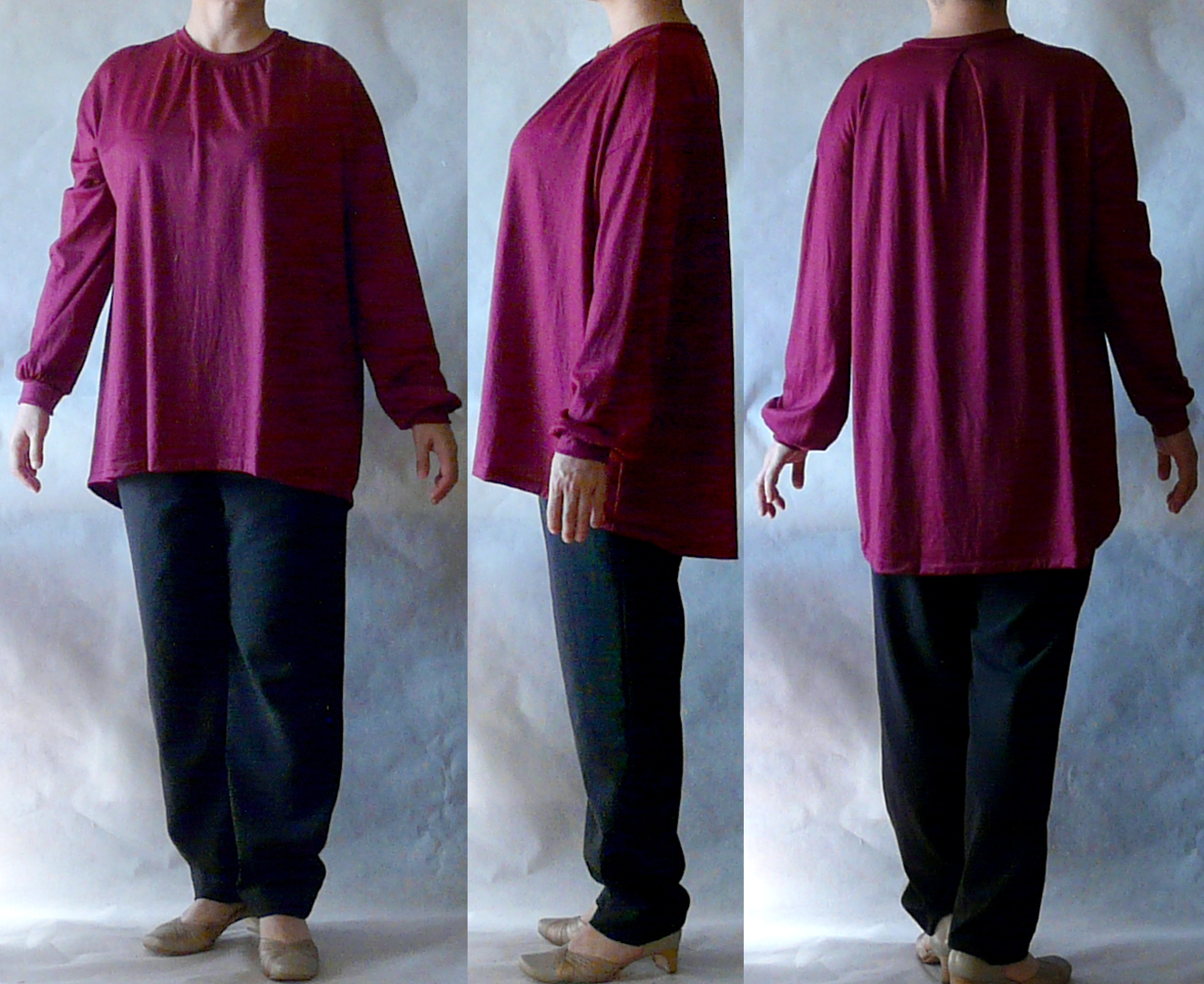 型紙:LR70060 ゆったりシルエットのモードT sizeM ¥1,320 (Annee-Patterns) https://annee-patterns.com/PDF_patterns/cutandsewn/pdf_LR70060 生地:赤紫:洗えるウールニット、薄グレー:モダールニット 型紙補正:幅出し4cm (写真:赤紫の洗えるウールニット) (写真;カフスをずりあげたところ。袖が溜まってかわいい。) 最初にLサイズで作ってみた。 大きいサイズをふにゃっと着た感じで、すごくかわいいけど、襟首が大きいし、肩とか手首とか、求めてるのとちがう。 とても大きいことはわかったので、Mサイズで、幅出しは中央で4cmだけ出してみた。これなら、前身頃はギャザーで、後ろ身頃はタックで吸収できる。 で、感想。 大きな声で言いたい。 販売サイトの絵型では、ぜんぜんわからないと思うけれど、これ、かわいい。 すっごくかわいい。 量産するし、母にも縫って布教する。 ふわっとした袖と、すぼまったカフスで、かわいいだけじゃなくて、空気が閉じ込められて暖かいし。 着心地もいいし。 腹肉も隠せるし。 裾がひらひらして、気分があがるし。 作るのめっちゃ簡単なのに、なんでこんなにかわいいの。 PR
