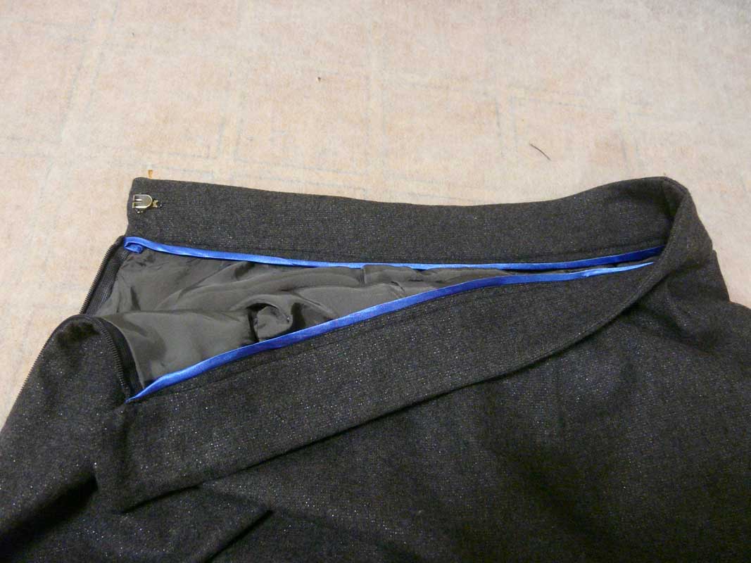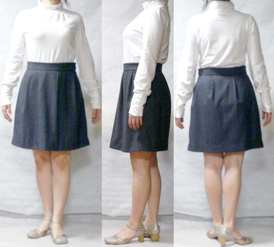生地:ウールストレッチ グレー ラメ入り 134巾×0.85m(¥600/0.9m) (服地のアライ) 裏地:キュプラ裏地 110cm巾×65cm 接着芯:SX2(ダンレーヌ) アレンジ: 巾だし +2cm タックの方向を中心高に 細部をわかりやすくするために、明度を上げてあります。 ひじょうに着心地のいいスカート。 個人的には、「959 台形ローライズミニスカート」よりも締め付けがなく、痛くなったり気分が悪くなったりしないし、ずり落ちない、優秀スカート。 ぽわんとした形もかわいい。写真より、動いたほうが、より「ぽわん」度がわかる。 タックは、思ったより分量が少なく、すっきりしている。 着丈も、個人的にはちょうどいい。トップスとのバランスが良い。 いちばん凝ったのは、ここ。 ベルト裏のパイピングを、手持ちのポリサテンで作りました。 きれいなブルーが、穿こうとするたびに、楽しくさせます。 PR