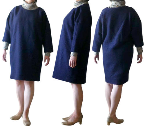 型紙:バレルライン、ドルマンカットソーワンピ 8Ringo~リンゴ sizeL ¥2,530 (Annee-Patterns) https://annee-patterns.com/dresses/pdf_8Ringo 生地:編み地のような厚地 アレンジ:なし 最近気がついたのだけれど、ドルマンスリーブは胸周りも大きくできているから、胸の幅出しは不要。 なので、お腹周りなどのサイズに合わせてサイズを選べばいいだけ。特に補正は要らない。 型紙を貼り合わせて切るだけ。補正不要。となると、作業がめっちゃ簡単。 あっという間にできました! ラインが、すごくかわいい! 静止画で見ると、イマイチ良さが伝わらない。動くと、生地にシワの縦ラインが出て、それがとてもすてき。 腰回りから膝までがもたつかないのもいい感じです。 ただ、袖が短いので、寒いのよ。 首回りも、ウールがちくちくして、肌に触れると痛いのよ。 試しに、ベルメゾンの「綿混あったかインナー・裏起毛ボリュームタートル十二分袖(超寒がりさん)」を着たら、下着っぽくて貧乏くさい。 写真ではTinaを着ています。たぶんIraもいい感じじゃないかな。 タートルAラインワンピース Tina~ティナ(Annee-Patterns) https://annee-patterns.com/dresses/pdf_8Tina オフタートルロングプルオーバー Ira(Annee-Patterns) https://annee-patterns.com/cutandsewn/pdf_7Ira …このワンピ、お腹ぽっこりが目立たないので何気に便利。 PR