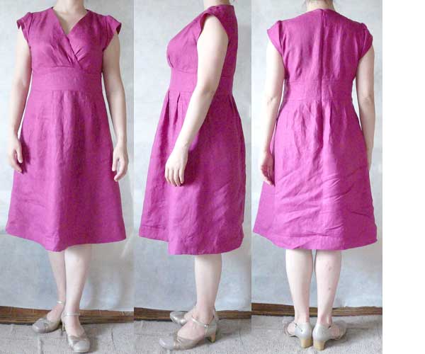 型紙:872 フレンチスリーブカシュクールワンピース size40 ¥2,572(セール価格) (anneecotton) 表生地:ソフトワッシャーリネンヘリンボーン・グレープ ¥600/m(会員価格) (かーふ) 裏地:キュプラ エンジ¥399(手芸ナカムラ) 副資材:キングスパン249番、56cmコンシールファスナー(ボビン) アレンジ1: スカートのギャザー寄せ → タック やわらかいリネンなので、ギャザーでもまったく問題はないが、これはパーティ用のシャンタンワンピの試作品。 シャンタンはハリがあるので、タックにしたいから。 アレンジ2: 反身体なので、後ろ身頃を1.5cmカット。 袖も直したいが、直し方がよくわからない。上にはストールかボレロを羽織る予定なので、いっか。 その他: 胸の谷間がビミョーに見え隠れするので、パーティ用には三角あて布をあてるか、中にキャミを着る予定。 このリネンのは、Tシャツの上に着る予定なので、このままでOK。 ウエストがぴったりと、ブログで読んで戦々恐々としていたけれど、着てみたらかなり余裕。ホッ。 肩のところに、ヘンなシワができる。 肩幅がなくて、体の厚みがあるからだと思う。 肩のタックで補正すべきだろうが、時間がないので、もうこのまま作る! アームホールが大きすぎて、下着が見える。なで肩補正が必要。 PR