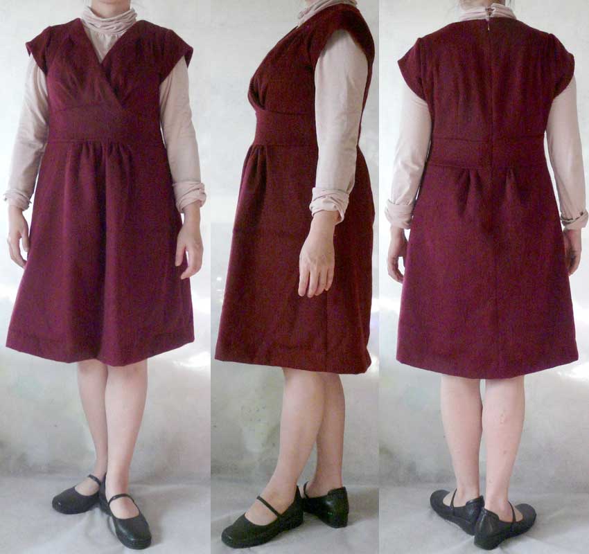 型紙:872 フレンチスリーブカシュクールワンピース size40 ¥2,572(セール価格) (anneecotton) 生地:毛混 フラノ【秋冬用(中厚長起毛)】 140cm巾×2m ボルドー ¥800(advance net) 裏地:キュプラ裏地 エンジ 135cm巾 1.5mカット 399 円(手芸ナカムラ) アレンジ: なで肩補正 0.5cm 前身頃 2cm幅出し 後ろ身頃丈 1.5cmカット 裾丈 7cmカット 前回、パーティドレスを作ったけれど、今回はフラノで。 タックにしたらおかしかったので、デフォルトのギャザーに変更。 反身体で、前ばかり太ったため、前身頃の幅が足りなくて、袖ぐりが前に引っ張られるので、今回は前だけ幅を足してみた。 前回はパーティドレスなので裾丈長めにしたけど、今回は普段着なので7cmカット。 5cmカットで、商品ページの写真くらいの丈になるけど、短めが好きなので。 生地は、去年、あんまり気に入って3つも買ってしまった長毛フラノ。コート地よりはかなり軽いし、縫ってみたら意外に薄い。 着たら、軽くてふわふわして、温かい。 毎年、夏と冬は義実家で着る服に困るのだけれど、これ着よう! PR