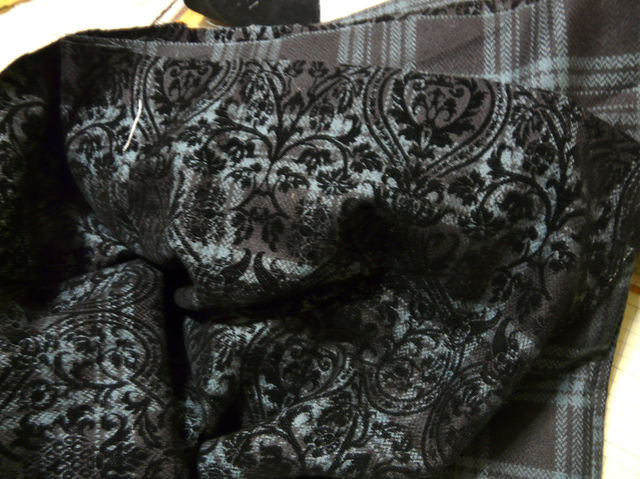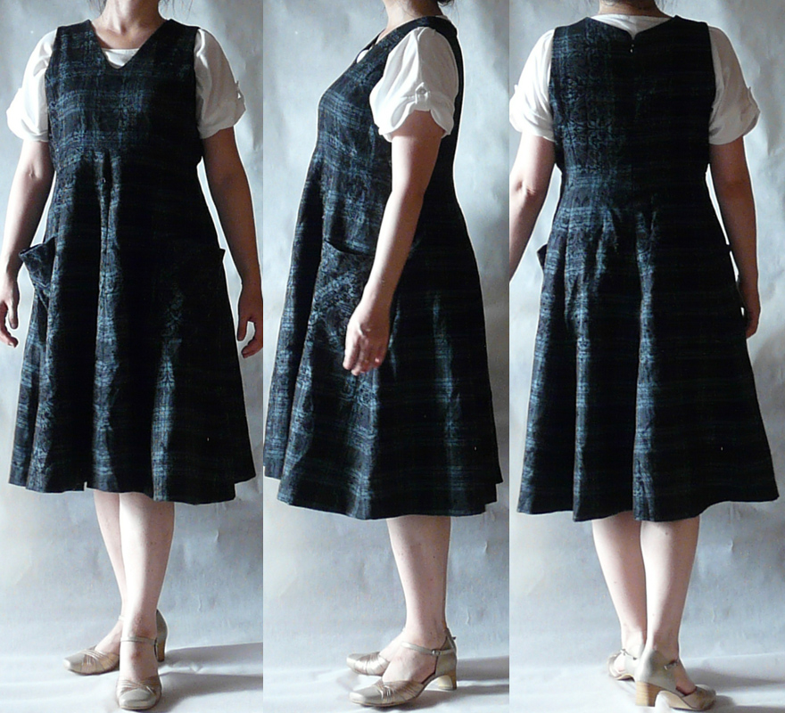 生地:青緑×黒のタータンチェックの表面に、黒の植物柄フロッキープリント 型紙補正:幅出し8cm 反身体補正で後ろ身丈-2.5cm、前身丈+3.0cm、前脇B補正+2cm(半身)、前脇幅さらに+1cm(半身) 珍しい生地です。。 やたら柄あわせの多い型紙なのですが、アネパターンのwebサイトにあるサンプルもチェック柄なので、どこで柄合わせしたらいいのか参考になりました。 基本的に、まず体の中心線(FC,BC)で、次にウェストの切り替えで合わせるのが良いです。 柄あわせ、はっきり言って死にました…。 スカートがひざ下まであり、フレアーもたっぷりなので、年配受けがよいです。 ジャンパースカートなので、コーディネートが気楽です。寒ければ中にセーターでもフリースでもカーデでも好きなのを着ればよいのです。 今回の型紙補正は、上半身を組んでから、いろいろ足りないことを発見。胸がキツキツで息が苦しかったのです。そのため、残布で前脇を取り直しました。 それでも、まだ前身頃の丈がぜんぜん足りていません。 NPを後ろに移動して、前身頃の丈をもっと足さなくちゃいけないんだろうな。 パネルはB補正や反身体補正が入れやすいのがよいところ。 PR