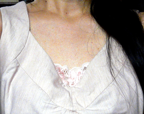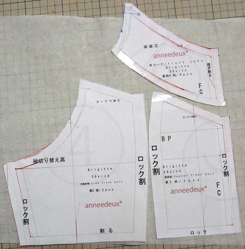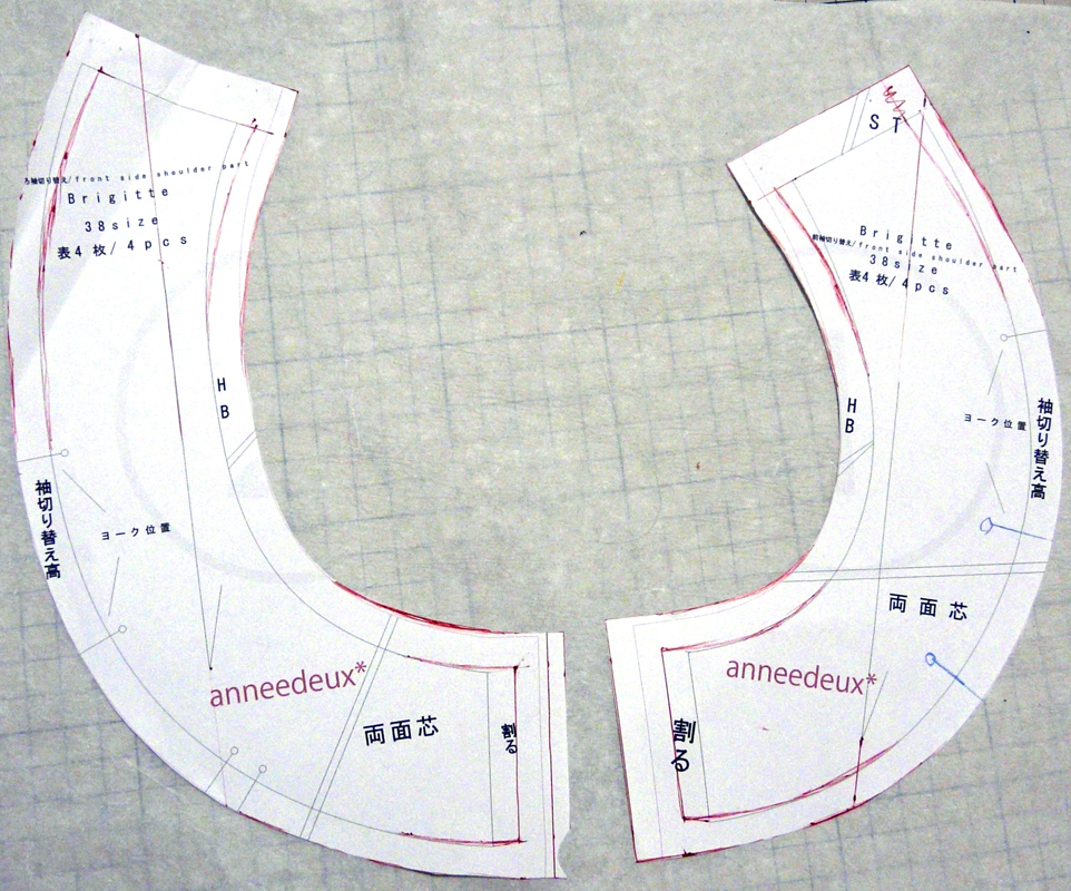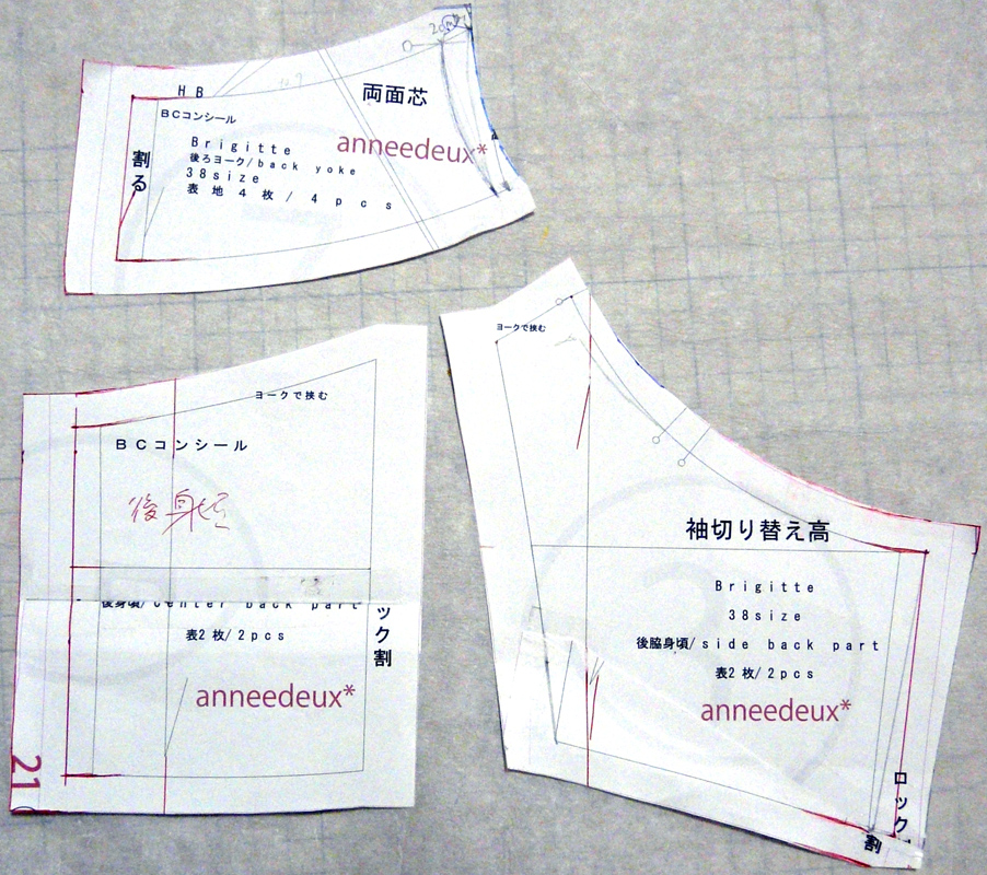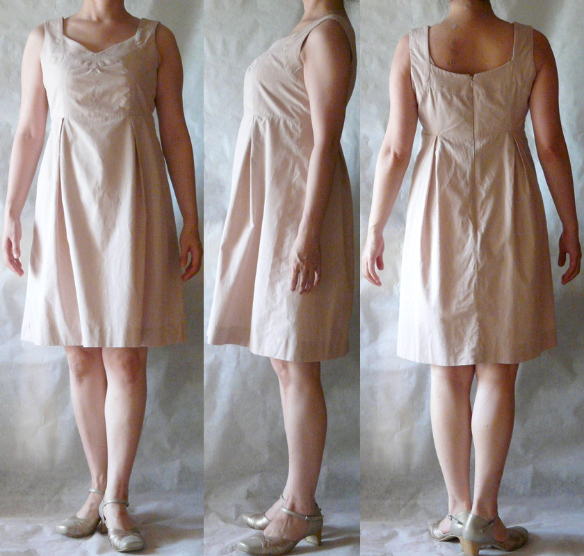 生地:くすんだ小豆色のシャツ地 140cm巾×1.4m ¥1000/m(魔法の布屋ショーワ) アレンジ: 幅出し6cm 反身体補正3cm その他、肩幅に合わせて、身頃の上部と襟を詰めた。 この服は、手間がかかる。 ・パーツが多い。 ・両面芯が多い。 ・手まつりが多い。 ・上半身がタイトだから、ファスナーが省略できない。 ので、時間に制限があるときには向かない。ゆっくりじっくり楽しみながら作る用。 早くも、量産決定。 夏は汗で背中に湿疹ができたり皮が剥けたり(皮膚科に通院するハメになる)するため、背中に密着する物を着ないようにしています。 キャミソールがいいけれど、ブラひもが見えるのはイヤ。 そんなときに、これは向いていると思う。 つまり、使い勝手がイイ。 私の体型は、前がとても太くて、背中は薄くて尻も薄い。(左図参照) なので、スカートの後ろのふくらみが、後ろの貧相さをカバーしてくれる。 化繊の余り布で、上半身のみトワルを組んでから、本番に入りました。 トワルの段階でわかったのは、前と脇の丈はあまり問題ないけど、後ろ中心が下がっているということ。 私の体型は、前よりむしろ、後ろのほうが凹凸が大きいんじゃないかしら? ので、おもいきって、背中の身頃に、普通は前身頃に対してするような丈補正を加えました。(後段、後ろ身頃の写真参照) そのほかには、肩幅が狭いために、襟の部分が浮いてしまうので、肩幅に合わせて、身頃の上部と襟の幅を詰めました。 前の補正。 幅出しを前身頃と前脇身頃、襟に施し、襟の上部を、肩幅に合わせて詰めています。 後ろの補正。 幅出しを後ろ身頃と後ろ脇身頃、襟に施し、襟の上部を、肩幅に合わせて詰めています。 反身体補正として、後ろ身頃の丈を3cmたたむ。 後ろ脇身頃は、脇の丈をそのままに、後ろ身頃との縫い合わせを考慮してダーツのようにたたむ。 袖パーツは、脇で幅出しをして、肩線の部分で肩幅に合わせて詰める。 スカート部分は、単純に幅出ししただけ。 生地は、昨夏、岡山のショーワで買った綿シャツ地です。張りがあるブロード。 お気に入りの色合いで、しかし、シャツ地を使うアイテムをめったに作らないので、使う機会がなかったもの。 シワになりやすいのが難点。 肌触りがとてもよく、夏向きの生地。 生地のアップはこちら。 経糸の色が微妙にちがい、繊細な表情です。 微妙な色合いで撮影が難しいですが、キングスパン#255ぐらいの色。薄いくすんだ小豆色にわずかに肌色を加えたような色。 今回はボビンオリジナルスパン#664肌色(キングスパン#84に相当)で縫いましたが、それよりわずかにピンク、もしくは赤紫寄りの色です。 とにかく色に惚れて買ってしまった生地です。 こういうデザインの欠点は、前屈みになったとき、胸元が見えること。 なので、この服を着るときは、ブラカバーが要ります。 小さなことだけど、ブラカバーがあれば、中は見えず、安心して着ていられます。つまり、ヘビーユースに耐えられる。 ブラカバーは簡単。 8cm幅以上の広幅のストレッチレースに、スナップを付けるだけ。 写真では、青丸で囲んだところに、プラスナップがついています。 付け方は、市販のブラカバーと同じ。ブラひもを囲んで留めるだけです。 レースの幅が広ければ広いほど、安定します。 それと、私は汗をかくと金属アレルギーが出るので、金属スナップは使わず、プラスナップを使っています。 写真のは直径10mmのもの。10こで300円ぐらいです。 チラ見えならストレッチレース一枚でじゅうぶんですが、襟ぐりがもっと広くて、見える部分が多ければ、下にニットやシフォンを重ねればいいと思います。 実際、パーティーで「872 フレンチスリーブカシュクールワンピース」を着たときは、見える分量が多かったので、シフォンの上にストレッチレースを重ねました。 http://yarns.blog.shinobi.jp/Entry/46/ PR
