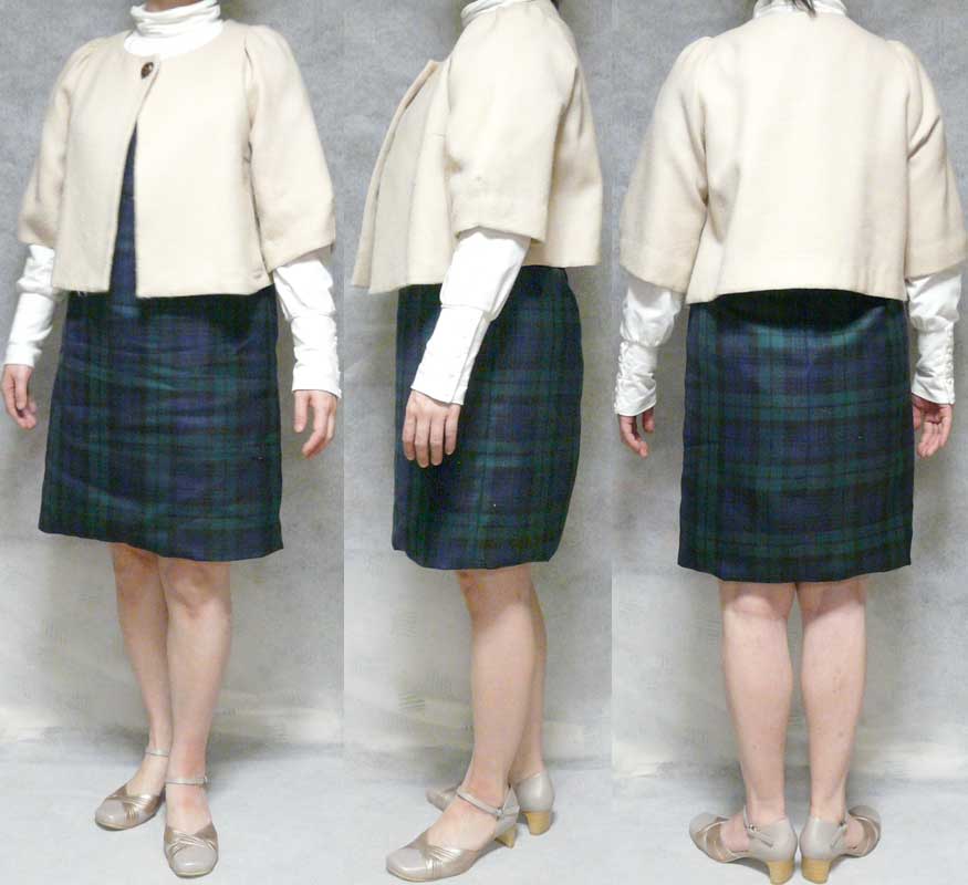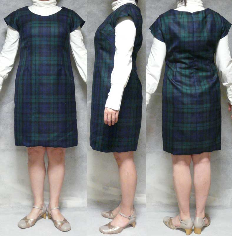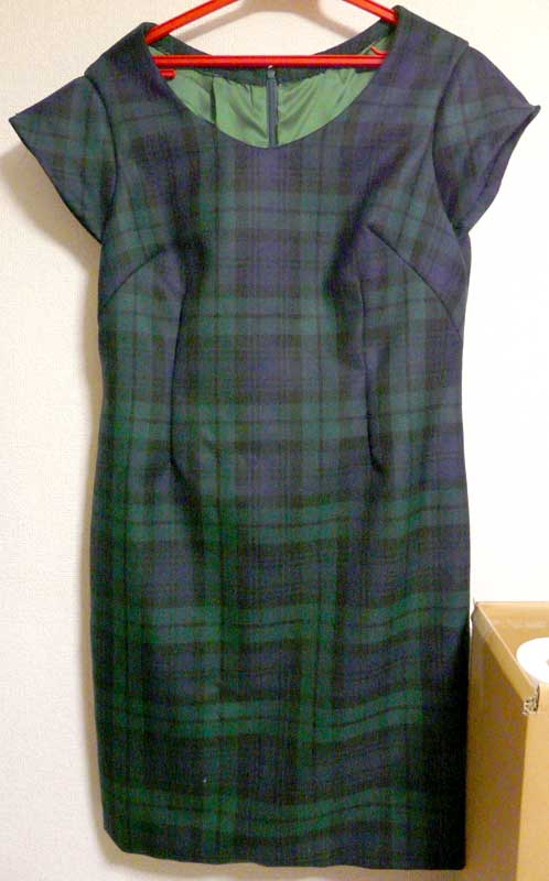 型紙:8Hemine 〜フレンチスリーブ ストレートミニワンピース エミネ size38 ¥2940(anneedeux) 生地:綾織ブラックウォッチ 140cm巾 ¥400/m(コスモ) 裏地:キュプラ 変わり織り 緑 140cm巾 ¥100/m (日暮里 幹) アレンジ:幅出し6cm、なで肩補正0.8cm、反身体補正2cm。襟ぐりはオプションのアレンジパーツ使用。 詳細追加しました。 ブラックウォッチは好きな柄だけれど、顔色が暗くなるので、このままでは着られず。 明るいミントグリーンのスカーフを胸元につけて着用することになります。 静止画より、動いたときのほうが、このパターンの良さを実感。 まるで、体の線が美しくなったかのように錯覚する。 そうとう気に入りました! ただし、アネモネと同様、もともと夏服用の型紙なので小さめ。 中に一枚なら着られるけど、さらにあったか下着などを着たければ、さらに幅出しが必要。 それと、すっごく立体的に作られているので、たたんでしまえません(笑) せっかくのステキラインが隠れてしまうのが残念。 たくさん着た後なので、シワシワ。 すわると、前にたくさん横皺ができてしまうので、生地選択時には念頭に置いたほうがいいかも。 PR